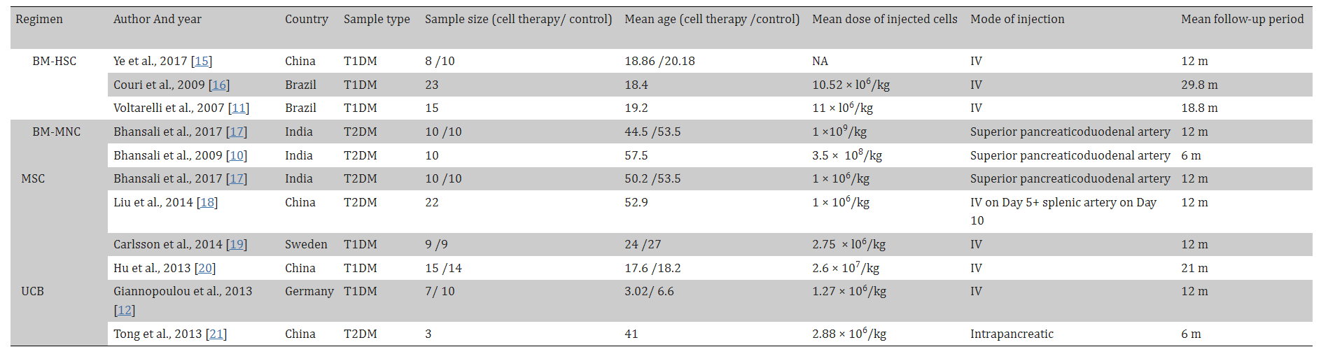 T1DM:1 型糖尿病;T2DM:2 型糖尿病;BM-HSCs:骨髓造血干細胞;BM-MNCs:骨髓單核細胞;MSCs:間充質干細胞;UCB:臍帶血;NA:不可用;IV:靜脈注射;M:幾個月