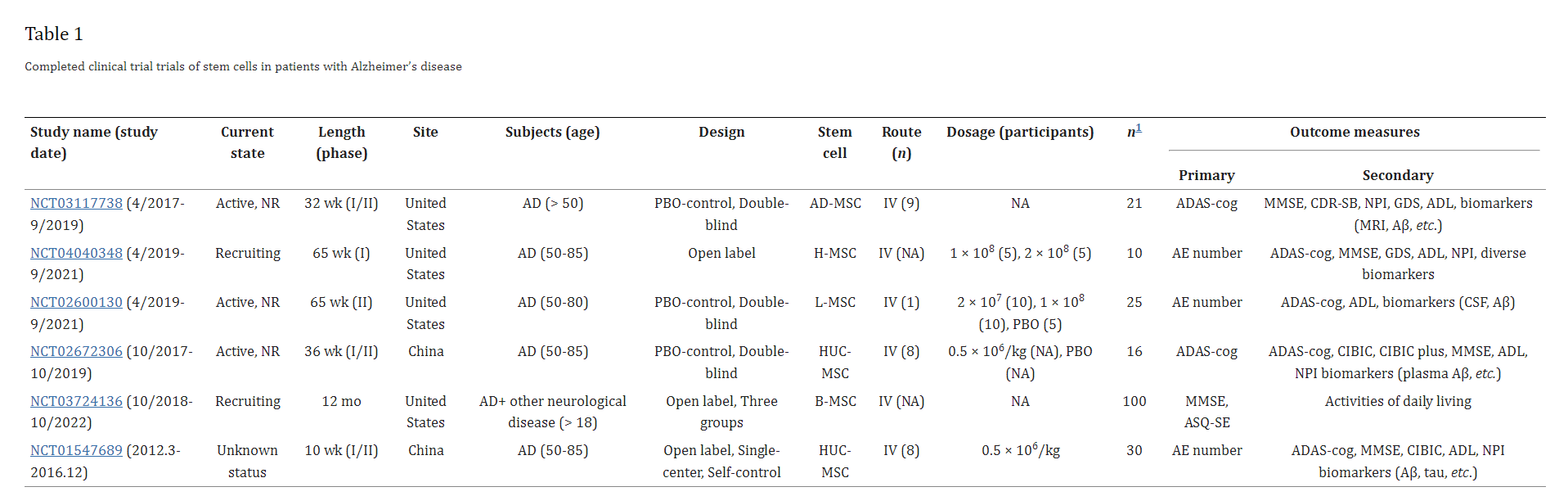 Aβ:淀粉樣蛋白-β;AD:阿爾茨海默病引起的癡呆癥;ADAS-Cog:阿爾茨海默病評(píng)估量表-認(rèn)知分量表;AE:不良事件;NPI:神經(jīng)精神病學(xué)量表;CSF:腦脊液;AD-MSC:自體脂肪組織來(lái)源的間充質(zhì)干細(xì)胞;H-MSC:人間充質(zhì)干細(xì)胞;L-MSC:白血病間充質(zhì)干細(xì)胞;B-MSC:骨髓間充質(zhì)干細(xì)胞;HUC-MSC:人臍帶血間充質(zhì)干細(xì)胞;ADL:日常生活活動(dòng);NA:不可用;CDR-SB:臨床癡呆評(píng)定量表的總和;GDS:老年抑郁量表;MMSE:最低精神狀態(tài)檢查;CIDIC:Composite International Diagnostic Interview Core;PBO:安慰劑;IV:靜脈內(nèi);ASQ-SE:年齡和階段問(wèn)卷-社會(huì)-情感。