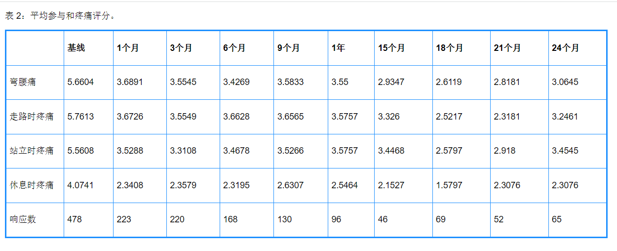 在手術后一年,17.5%的患者報告了疼痛評分(N=96)。靜息狀態2.54、站立3.57、行走3.57和彎曲3.55的平均報告疼痛評分。在手術后15個月到21個月,參與度和平均疼痛評分是可變的,如表2所示。術后2年(24個月)時,11.8%的患者報告了疼痛評分 (N=65)。手術后兩年(24個月),報告的平均疼痛評分為靜息狀態2.30、站立狀態3.45、行走狀態3.24和彎曲狀態3.06。