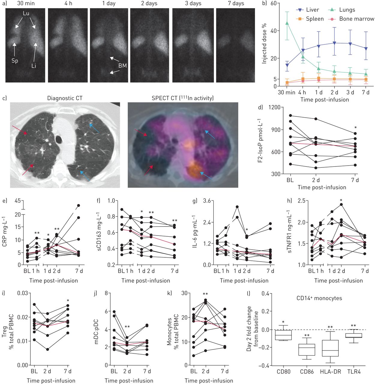 促炎標志物如 C 反應蛋白 (CRP) 在輸注后 1 小時至 2 天內顯著升高 (e)