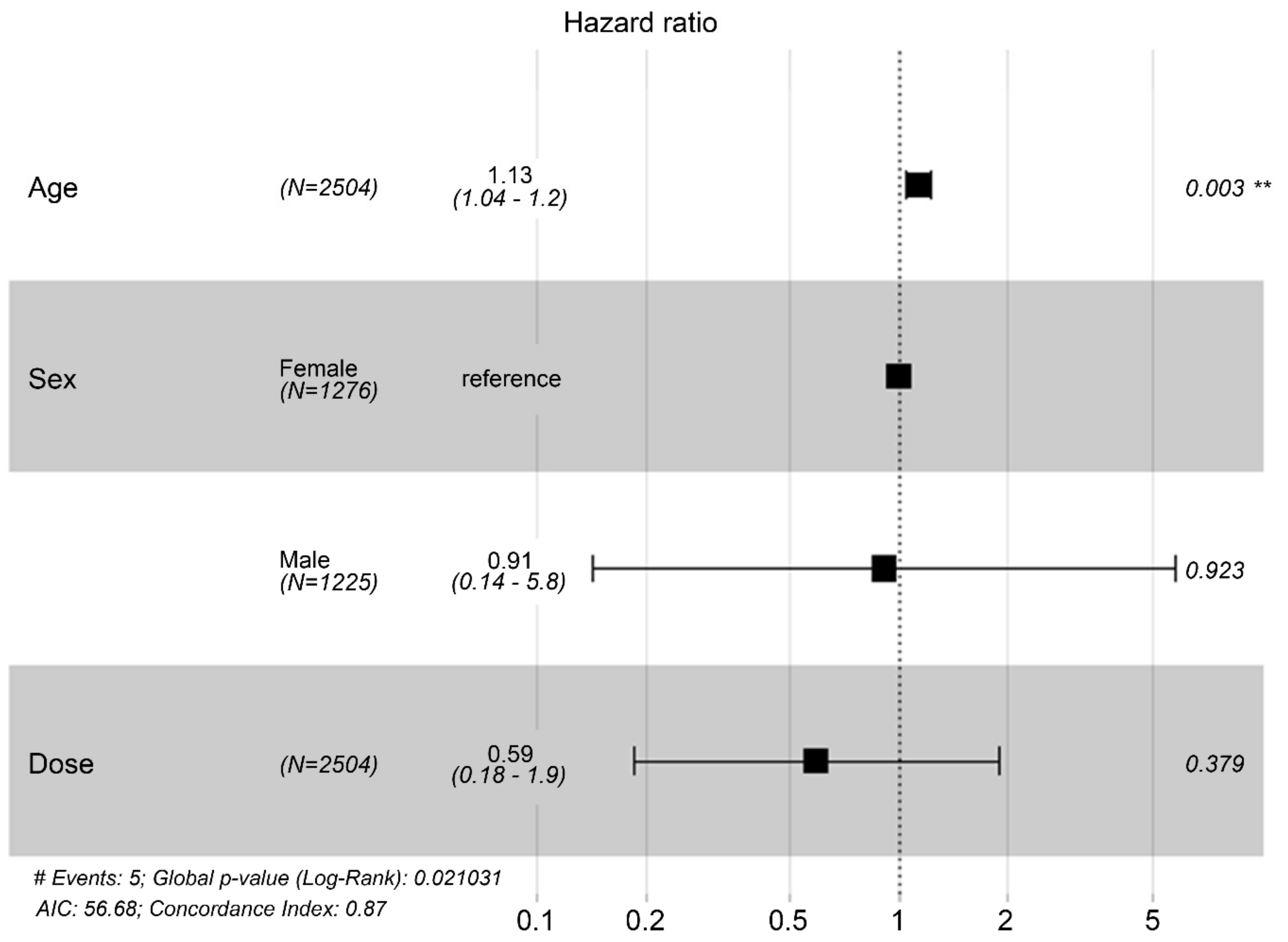 在平均112個月的觀察期內,共有5例重大不良心腦血管事件和死亡(標準誤差=0.435;表2和圖1),包括4例死亡(1例死于2019冠狀病毒病相關肺炎,1例死于無關事件,1例死于自然原因[老齡],1例死于中風)和1例非致命性中風。這意味著隨訪期間的MACCE發生率為0.20%。在單變量Cox比例風險回歸分析中,對年齡、性別和MSC劑量的分析顯示,只有年齡與重大不良心腦血管事件風險顯著相關(表3)。