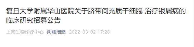2022年3月,復旦大學附屬華山醫院關于臍帶間充質干細胞 治療銀屑病的臨床研究招募公告。