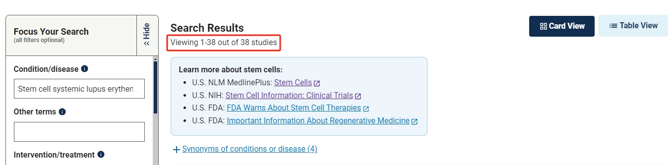 截止2024年3月,在美國國立衛(wèi)生研究院的最大臨床試驗(yàn)注冊庫clinicaltrials.gov網(wǎng)站上注冊的有關(guān)干細(xì)胞治療系統(tǒng)性紅斑狼瘡的臨床研究項(xiàng)目有38項(xiàng)。
