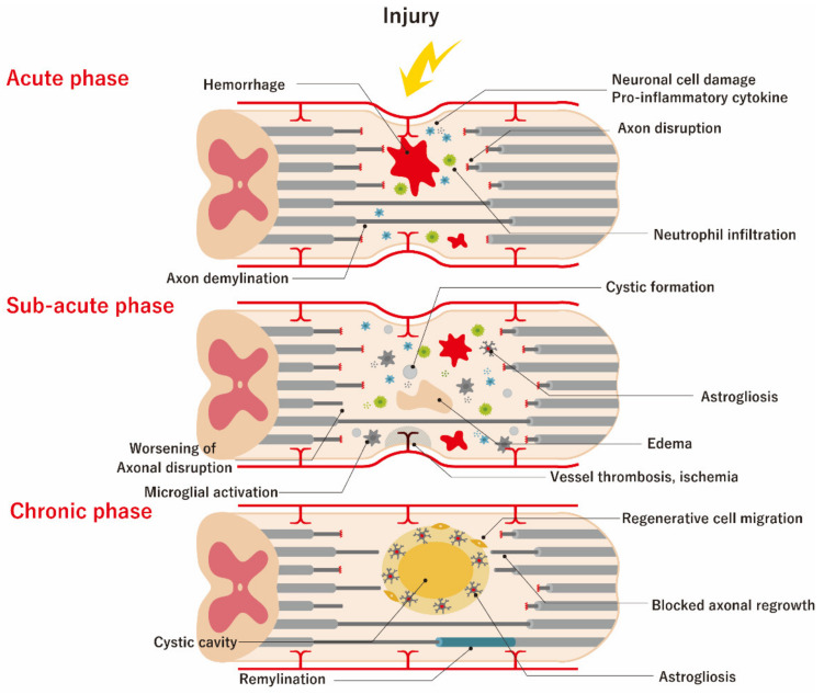 SCI包括兩種截然不同的機制。一種是脊髓受壓挫傷引起的原發性損傷,導致損傷時神經元和神經膠質細胞膜的損傷以及微血管系統的破壞。另一種是繼發性損傷級聯,包括出血和水腫引起的組織腫脹、炎癥、細胞毒性自由基和興奮性毒性物質的產生以及過度神經膠質增生,其發展需要數小時至數月。常規進行超早期手術干預,包括脊髓減壓和脊柱固定,但通常很難從SCI中完全恢復,因為原發性損傷在受傷時已經發生。因此,目前脊髓損傷治療的主要目標是減少或停止繼發性損傷級聯,繼發性損傷級聯可分為急性(數日內)、亞急性(數日至6個月)和慢性(>6個月)相 (圖2)。