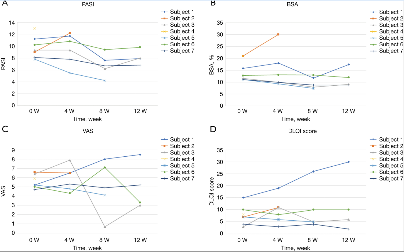 PASI評分從基線到第12周的改善率范圍為-0.36%至46%。圖2顯示了7名參與者的一些結果測量值。PASI 分數從基線到第12周逐漸下降(圖2A)。然而,在基線和第12周之間,PASI、BSA、VAS 和DLQI評分沒有統計學上的顯著差異(參見圖2B-2D)。在試驗過程中,沒有參與者達到PASI-50或PASI-75。