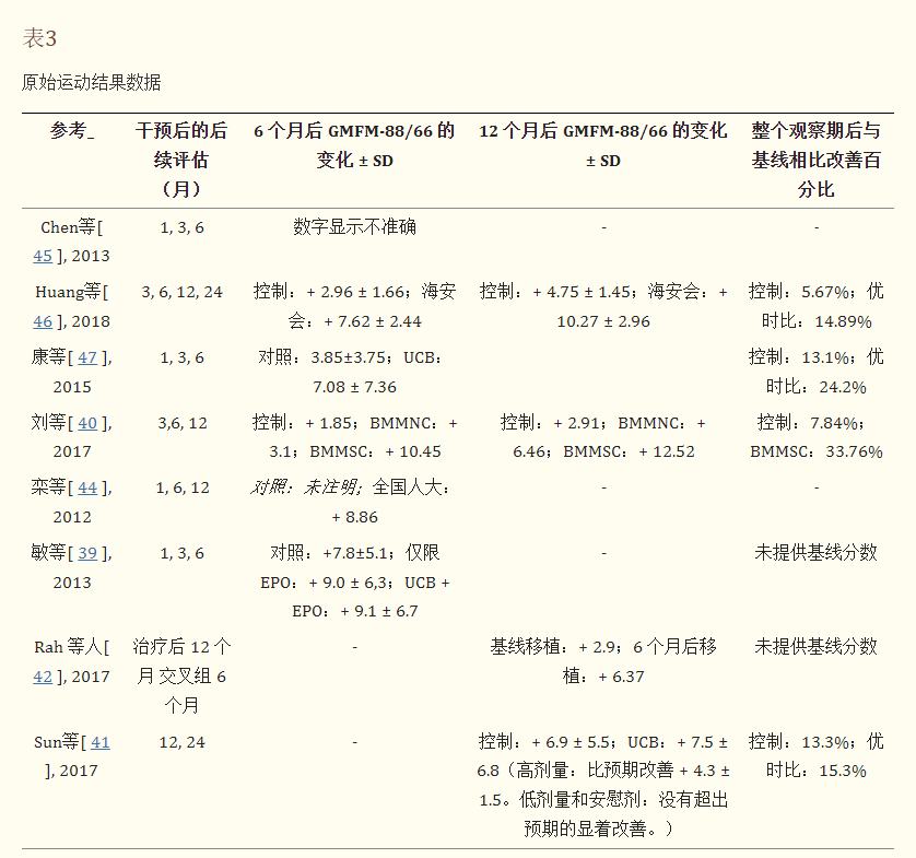 包括的所有患者都被診斷為CP。CP的嚴重程度是用粗大運動功能分類系統來衡量的,它將CP的癥狀分為5個等級,其中5級是最嚴重的運動障礙。試驗中干細胞的類型和劑量不同。