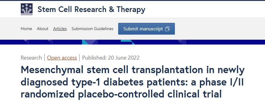 2022年6月20日,伊朗德黑蘭 ACECR 魯瓦揚(yáng)干細(xì)胞生物學(xué)與技術(shù)研究所在國(guó)際期刊《Stem Cell Research and Therapy》上發(fā)布了一篇《新診斷的 1 型糖尿病患者的間充質(zhì)干細(xì)胞移植:一項(xiàng) I/II 期隨機(jī)安慰劑對(duì)照臨床試驗(yàn)》的研究結(jié)果。