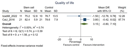 生活質量:對兩項使用SF-36量表報告生活質量 (QOL) 的研究進行薈萃分析,結果顯示,在12個月的隨訪期間,干細胞接受者的QOL評分比對照組高出三個百分點(圖2)。