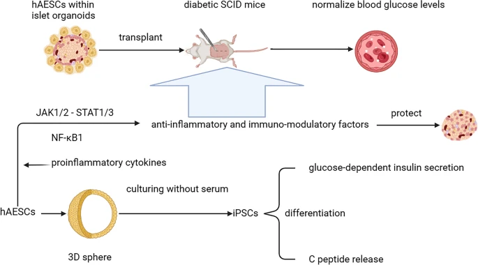 間充質干細胞(MSCs)的臨床研究(如骨髓與臍帶來源MSCs)雖在動物模型中展現出修復胰島微環境、調控Th17/Treg平衡及促進血管新生的能力,但其功能異質性、體內存活率低及致瘤風險仍制約臨床轉化。相較之下,hAESCs因其胚胎源性低免疫原性、多向分化潛能豐富的旁分泌因子庫,展現出更優的臨床應用前景。