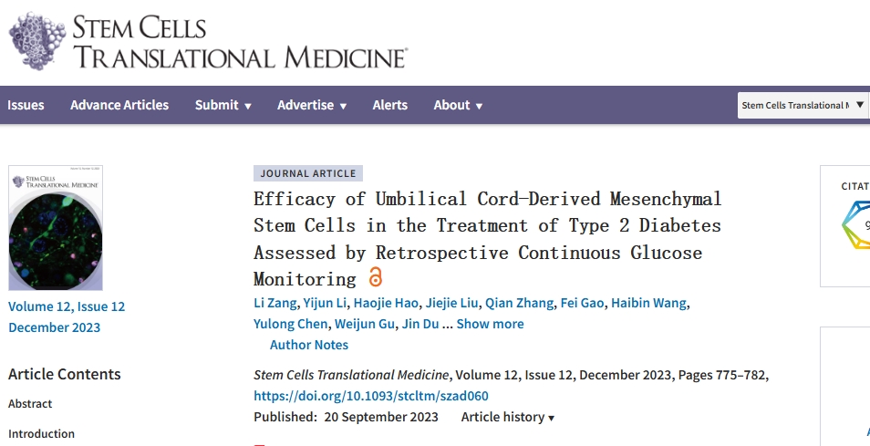 2023年,解放軍總醫院第一醫學中心在權威期刊雜志《干細胞轉化醫學》發表了一篇有關“通過回顧性連續血糖監測評估臍帶間充質干細胞治療2型糖尿病的療效”的臨床研究文章[1]。