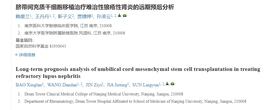 2014年8月14日,南京大學(xué)醫(yī)學(xué)院附屬鼓樓醫(yī)院在行業(yè)期刊《Clinical Rheumatology》上發(fā)表了一篇關(guān)于《異基因間充質(zhì)干細(xì)胞移植治療對(duì)常規(guī)療法無(wú)效的狼瘡性腎炎患者》的研究成果。【1】