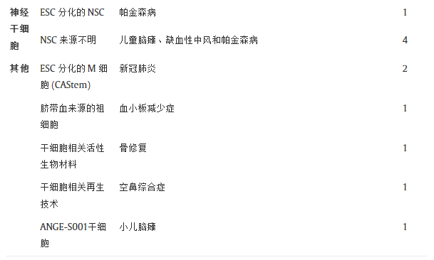 從表中可以看出,干細(xì)胞或干細(xì)胞衍生的治療產(chǎn)品用于治療各種疾病和醫(yī)學(xué)狀況,包括腦和神經(jīng)系統(tǒng)疾病、心臟病、糖尿病、肝病、肺病、血液病、關(guān)節(jié)炎和炎癥。特別值得注意的是,在這100個臨床研究項(xiàng)目中,9個人類ESC相關(guān)研究正在進(jìn)行中,其中3個研究是在ESCs誘導(dǎo)成MSCs后進(jìn)行的,3個是上皮干細(xì)胞,2個是M/CAStem細(xì)胞(人ESC衍生的免疫和基質(zhì)調(diào)節(jié)細(xì)胞)和1轉(zhuǎn)化為神經(jīng)干細(xì)胞。