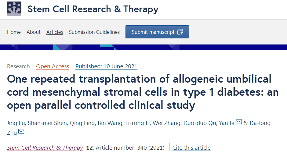 2023年5月21日,最新發表在《Diabetologia》糖尿病學雜志(2022年影響因子/JCR分區:10.460/Q1)的一項來自瑞典的I/II期隨機雙盲安慰劑對照試驗證實,臍帶來源的間充質干細胞可維持1型糖尿病患者內源性胰島素的產生。