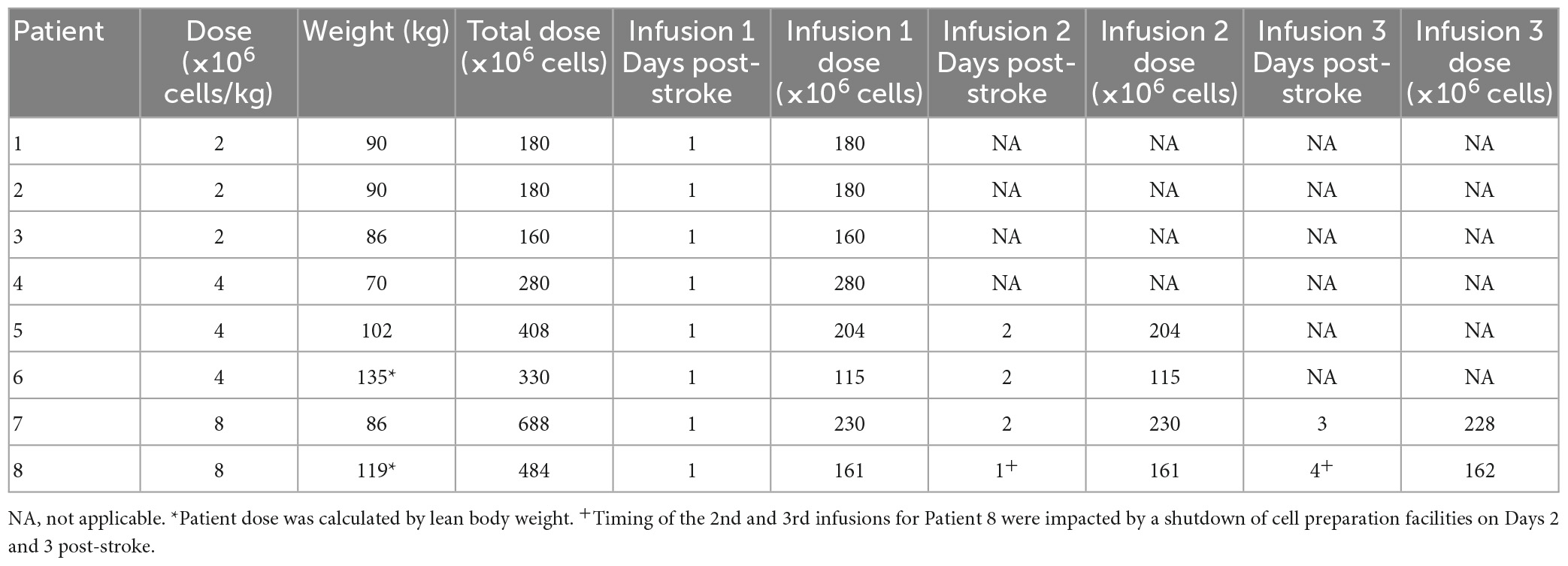 該I期試驗的臨床方案先前已發布。我們在下面提供了納入和排除標準的摘要。給藥方案是根據兩名體型較大的患者(患者6和8)的去脂體重計算的。由于招募率較低,我們修改了第一階段試驗的原始計劃,以納入接受溶栓治療的患者。這一步驟得到了我們的動物實驗的支持,表明hAEC與阿替普酶(手稿正在準備中)聯合給藥時可提供神經保護。當試驗的主要終點(確定安全劑量范圍和最大耐受劑量)被認為已達到時,試驗終止,招募了8名患者。