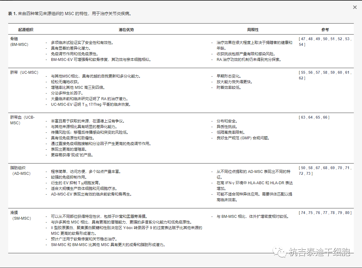 表1:來自四種常見來源組織的MSC的特性,用于治療關(guān)節(jié)炎疾病。