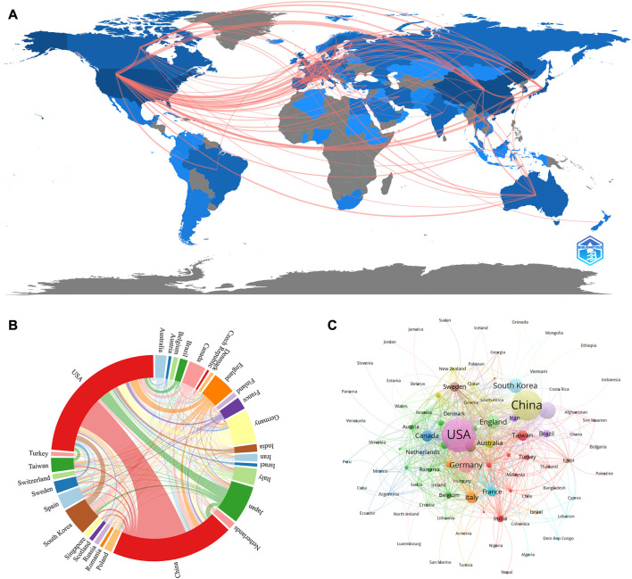 從地域分布來看,共發表文獻6,703篇,來自94個不同的國家和地區;表格1顯示該類別中排名前10的國家/地區。可以看出圖3B和補充圖S1,我們還使用VOSviewer對國家或地區進行可視化分析。美國發表論文最多(1,555篇,占25.61%),其次是中國(738篇,占12.15%)和日本(714篇,占11.76%),表明這三個國家在該領域發揮著至關重要的作用。然后利用每個國家出版物的數量和之間的聯系來創建一個協作網絡(圖3A)。對這一領域出版物數量最多的30個國家進行了國家合作分析(圖3C)。從總鏈接強度來看,排名前五的國家/地區為美國、中國、日本、德國、韓國。