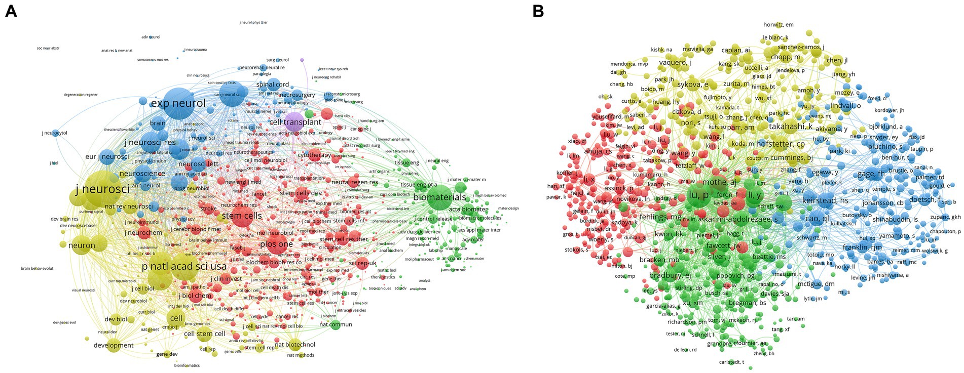 (A)脊髓損傷研究干細(xì)胞療法的1,000種期刊的共被引分析圖。