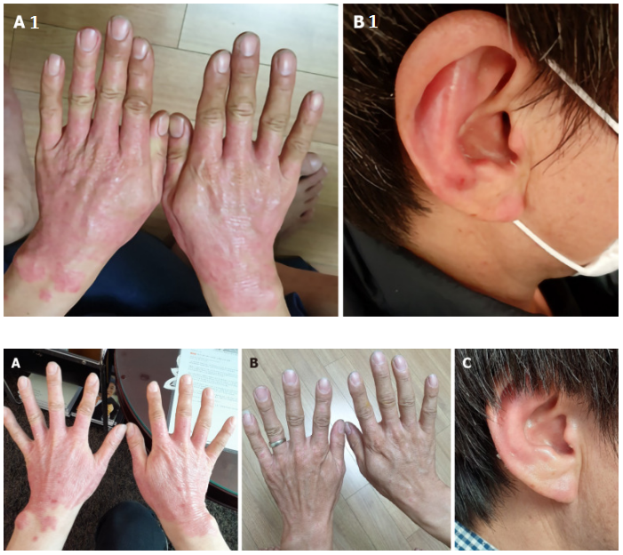 圖:A1,B1為治療前,A治療后15天,B、C治療后122天,可見(jiàn)紅斑已消退在治療過(guò)程中,該患者未出現(xiàn)包括皮炎、發(fā)燒、發(fā)冷或惡心等不良反應(yīng),證實(shí)了間充質(zhì)干細(xì)胞治療的安全性和有效性。