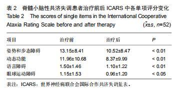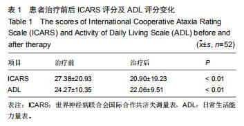 除1例共濟(jì)失調(diào)患者治療無(wú)效外,其余患者均有效,表現(xiàn)為行走和站立不穩(wěn)、運(yùn)動(dòng)遲緩、上肢精細(xì)動(dòng)作障礙、書寫困難、構(gòu)音障礙等臨床癥狀得到改善。