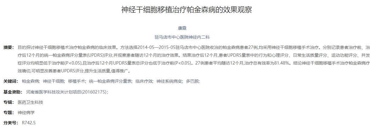 同年,駐馬店市中心醫(yī)院神經(jīng)內(nèi)二科在中國知網(wǎng)發(fā)表了“神經(jīng)干細(xì)胞移植治療帕金森病的效果觀察”的文章[1]。