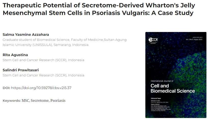 [5]Azzahara, S. Y., Agustina, R., & Prawitasari, S. (2024). Therapeutic Potential of Secretome-Derived Wharton’s Jelly Mesenchymal Stem Cells in Psoriasis Vulgaris: A Case Study. International Journal of Cell and Biomedical Science2(5), 160-166. https://doi.org/10.59278/cbs.v2i5.37