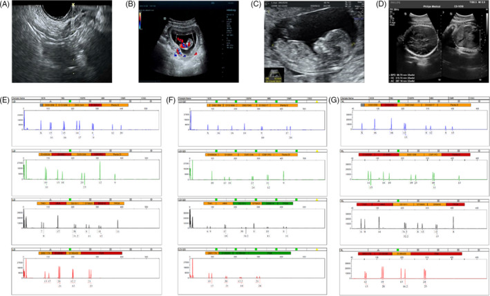 圖2:妊娠和新生兒結局。(A)超聲掃描顯示USMSCs移植過程中有穿刺過程;(B-D) 孕周 8 周 (B)、13 周 (C) 和 32 周 (D) 妊娠患者的超聲檢查;(E-F) 母血(E)、胎兒臍帶(F)和供體細胞(UCMSCs)(G)的微衛星位點分析