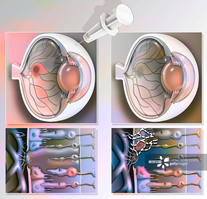 濕性AMD:對于濕性AMD,醫生使用藥物治療和手術技術來幫助保持現有視力。目前的一線治療是向患眼注射藥物以抑制新血管的形成。這些藥物會阻止血管內皮生長因子或VEGF的產生,VEGF會向身體發出信號以制造新血管。對于許多人來說,需要每四到六周重復注射一次。