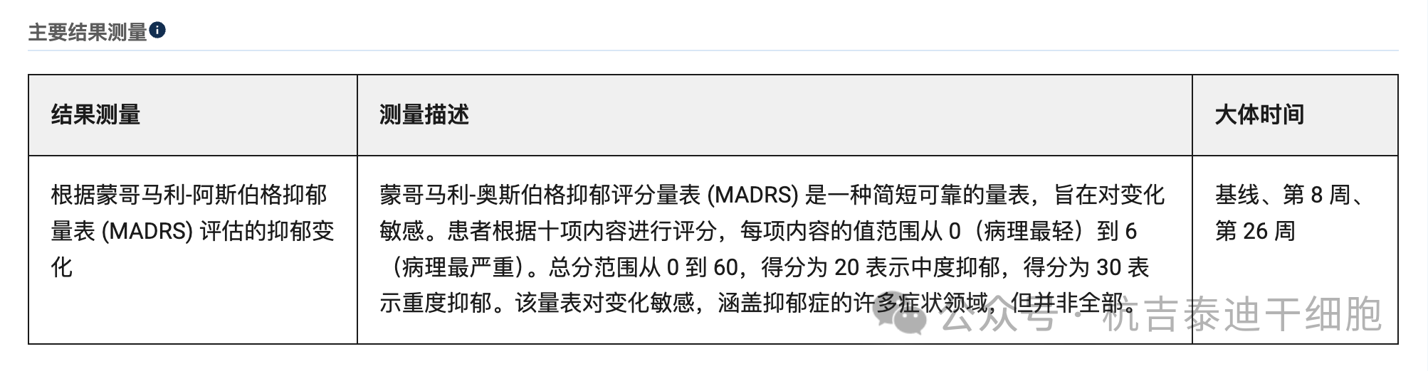 正式名稱:一項(xiàng)I期前瞻性、隨機(jī)、雙盲、安慰劑對照試驗(yàn),旨在評估同種異體人類間充質(zhì)干細(xì)胞輸注與安慰劑對難治性抑郁癥患者的安全性和潛在療效。