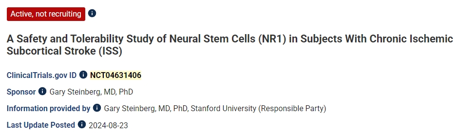 本研究首次利用胚胎源性神經(jīng)干細胞 (NR1) 進行腦內(nèi)移植治療慢性缺血性中風的1/2a期人體研究 (NCT04631406),旨在在12個月內(nèi)評估 NR1腦內(nèi)移植對慢性中風患者的安全性和有效性為后續(xù)療效驗證奠定基礎(chǔ),同時回應(yīng)學(xué)界對NSCs臨床可行性的核心關(guān)切。