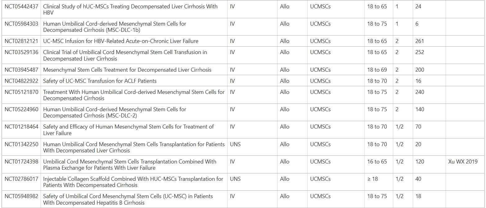 表5:間充質干細胞治療肝功能衰竭或肝功能失代償的臨床試驗