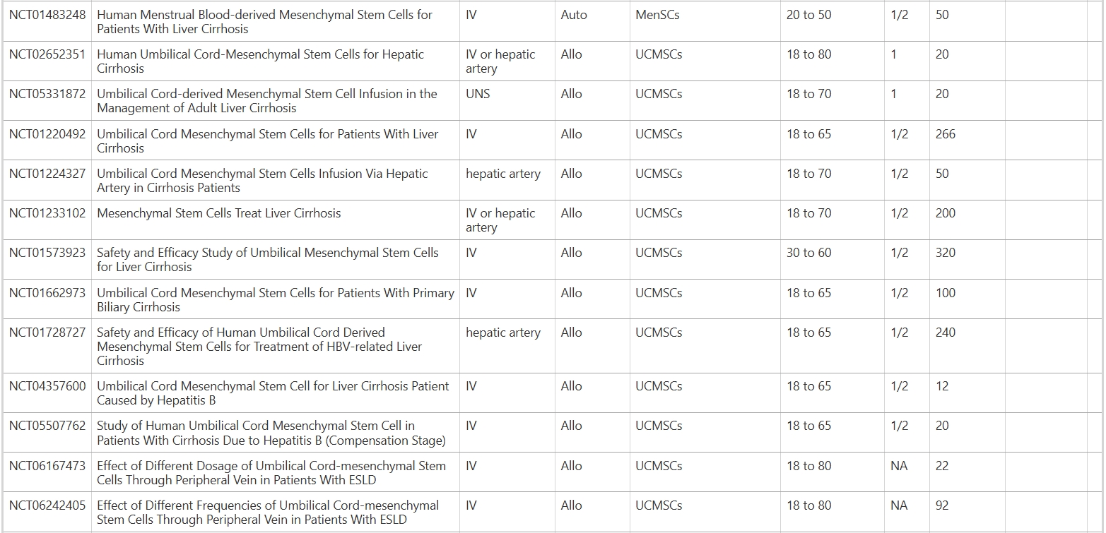 目前,肝移植是治療肝硬化的少數有效方法之一,但它面臨著諸多挑戰,包括供體短缺、手術并發癥、移植排斥和高昂的費用。為了應對這些挑戰,MSC療法應運而生,成為一種可選的治療方法。目前有31項臨床試驗正在研究MSC治療肝硬化(表4)。