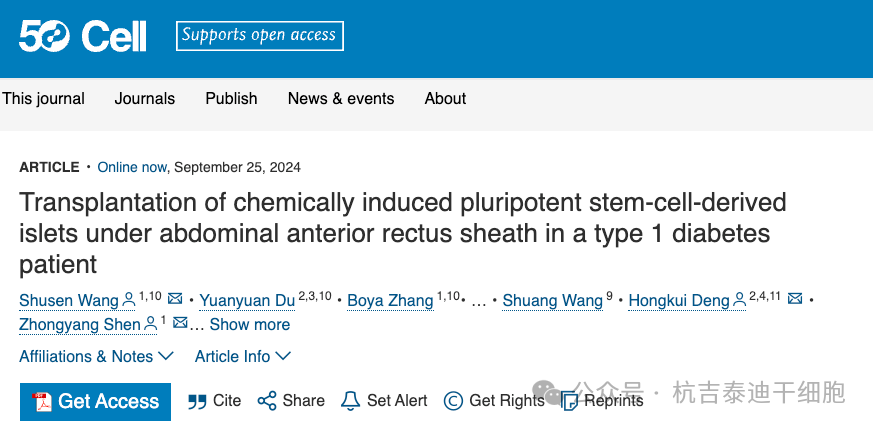 2024年9月25日,天津市第一中心醫院沈中陽、王樹森研究組聯合北京大學昌平實驗室鄧宏魁研究組在Cell發表題為“Transplantation of Chemically Induced Pluripotent Stem-Cell-Derived Islet Under Abdominal Anterior Rectus Sheath in a Type 1 Diabetes Patient”的研究論文,在國際上首次報道了利用化學重編程誘導多能干細胞制備的胰島細胞移植,治療1型糖尿病的臨床研究。