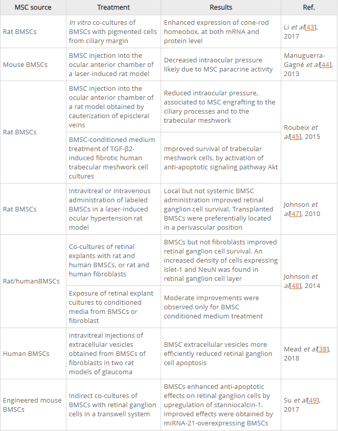 在基于MSC的治療后獲得的結(jié)果總結(jié)在表2中。它們中的大多數(shù)表明RGC存活率提高、功能性RGC樣細(xì)胞的產(chǎn)生以及成熟RGC中常駐視網(wǎng)膜干細(xì)胞的擴(kuò)增和分化。盡管玻璃體內(nèi)給藥通常會產(chǎn)生少量的MSC植入和視網(wǎng)膜分化,但有益效果也歸因于MSC釋放的神經(jīng)營養(yǎng)因子。