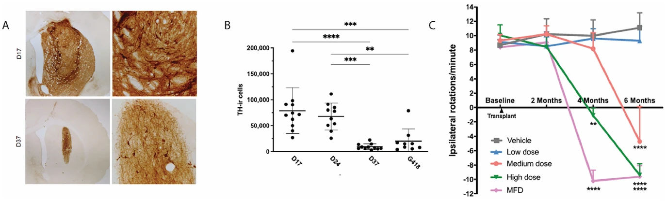 結果表明:移植物可長期存活(18–24個月),并成功向殼核及尾狀核延伸神經支配;功能評估顯示,[18F]DOPA-PET 檢測到多巴胺生成恢復至正常水平的約50%,且運動評分顯著改善。同時,移植物安全性得到驗證——未觀察到腫瘤形成(如菊花結)、異常增殖細胞(Ki-67-)或運動障礙,為臨床轉化奠定了基礎。