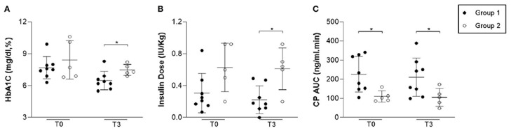 (A) 在ASC輸注前 (T0) 和三個(gè)月后 (T3) 測(cè)量的HbA1C水平。第1組的HbA1C水平顯著低于第2組 (p=0.03)。(B) 在 ASC 輸注前 (T0) 和三個(gè)月后 (T3) 所需的胰島素劑量。第1組所需的胰島素劑量顯著低于第2組 (p=0.01)。(C) 在 ASC 輸注前 (T0) 和三個(gè)月后 (T3) 測(cè)量的C肽AUC。第1組和第2組的C肽AUC沒(méi)有顯著差異 (p=0.06)。圖中的星號(hào)表示兩組之間存在統(tǒng)計(jì)學(xué)上的顯著差異。