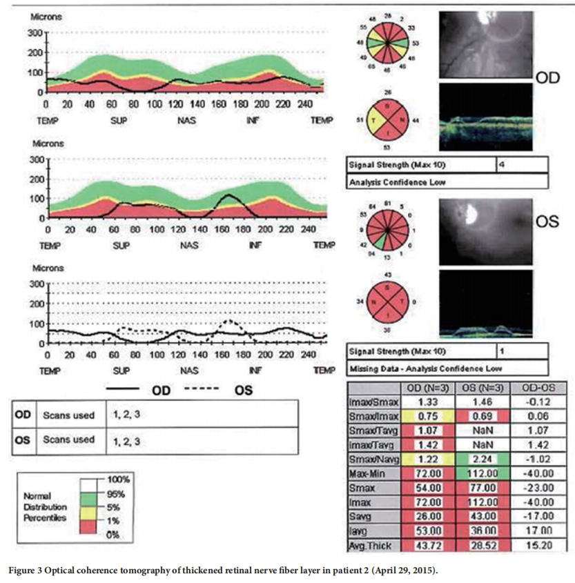 患者2:23歲女性,出現頭痛、頸麻木及視乳頭水腫,MRI顯示小腦扁桃體下疝伴顱內高壓。乙酰唑胺治療后周邊視力改善,但8個月內進展為雙眼中心視力喪失至手動視力(HM),被診斷為LHON-3460突變,OCT顯示黃斑及RNFL變薄(圖1、2),雙眼視神經蒼白。
