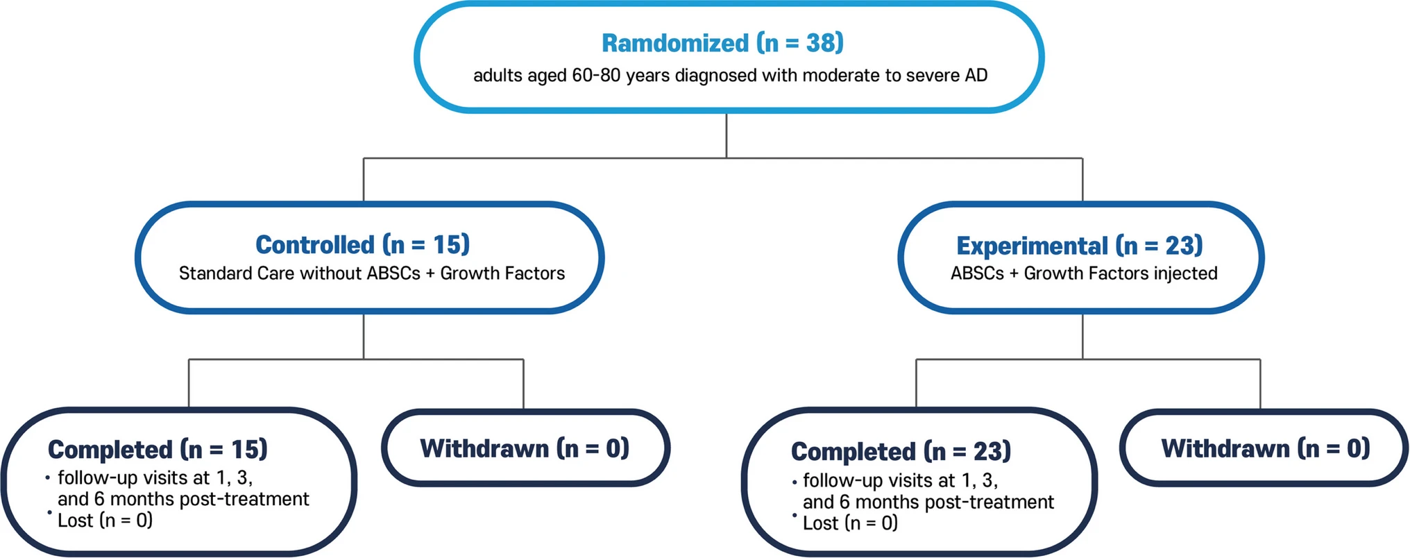 研究對象與干預措施:納入年齡60–80歲、經臨床及β-淀粉樣蛋白PET-CT確診的中重度AD患者。受試者隨機分為兩組:實驗組接受ABSCs聯(lián)合生長因子(BDNF、VEGF、IGF-1)靜脈輸注;對照組僅接受標準藥物治療。ABSCs取自患者外周血,經密度梯度離心與流式細胞術鑒定后新鮮制備,于3小時內回輸,不予體外擴增。生長因子按標準化劑量配制。全療程共進行3次輸注,每次間隔4周。