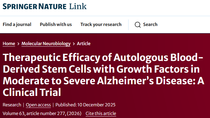 參考資料:[1]:Lee, W.J., Cho, K., Lee, D. et al. Therapeutic Efficacy of Autologous Blood-Derived Stem Cells with Growth Factors in Moderate to Severe Alzheimer’s Disease: A Clinical Trial. Mol Neurobiol 63, 277 (2026). https://doi.org/10.1007/s12035-025-05583-0