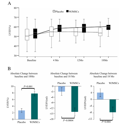 在隨訪的第3、6和12個(gè)月時(shí)經(jīng)胸超聲心動(dòng)圖和心臟MRI評(píng)估,只有經(jīng)UC-MSCs治療組顯示出左心室射血分?jǐn)?shù)的顯著改善。兩組間超聲心動(dòng)圖左心室射血分?jǐn)?shù)從基線到第12個(gè)月的變化差異顯著。
