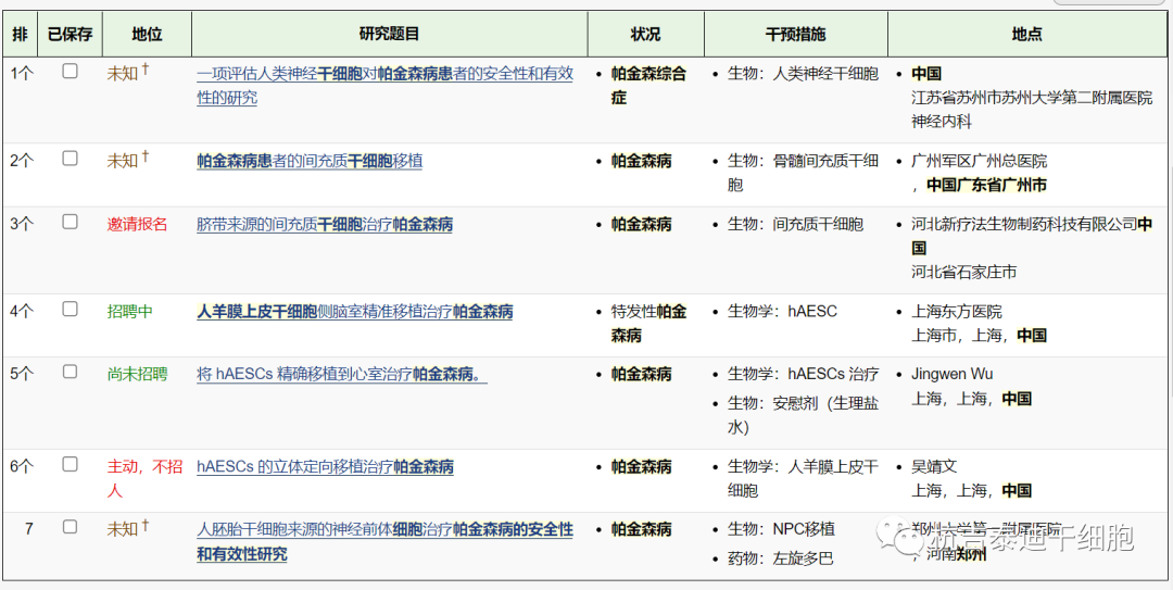 其中在中國干細胞治療帕金森病的臨床試驗有七項