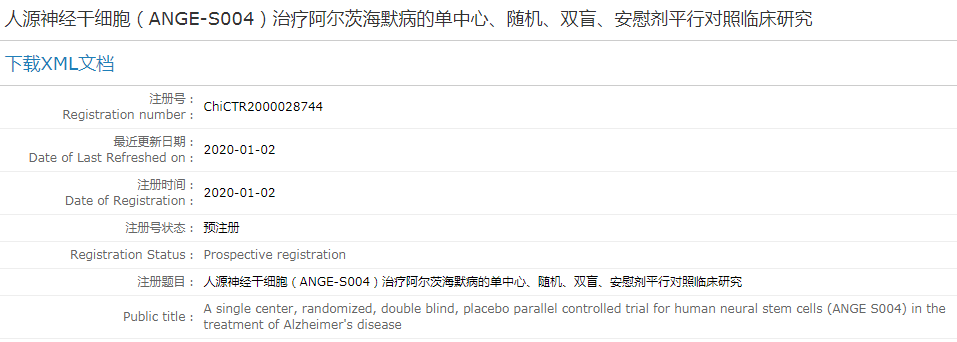目前,在中國臨床試驗注冊中心有多項關于干細胞治療老年癡呆的項目注冊,例如《人源神經干細胞(ANGE-S004)治療阿爾茨海默病的單中心、隨機、雙盲、安慰劑平行對照臨床研究》(ChiCTR2000028744)。