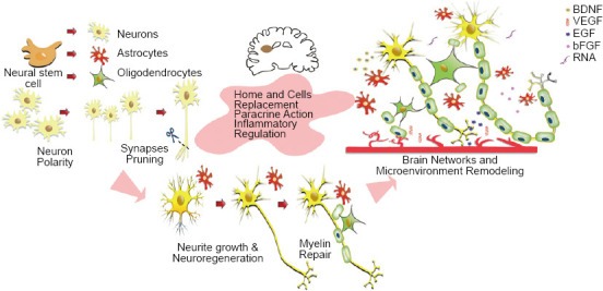 在臨床前卒中模型和人類卒中患者中,神經干細胞治療通過產生神經營養和再生生長因子來促進NVU形成并促進中風的組織和功能恢復,以促進NSC和血管隔室之間的血管生成。血管生成可以修復網絡以改善大腦中的血流并改善大腦功能。神經發生和血管生成對改善功能恢復結果具有協同作用。