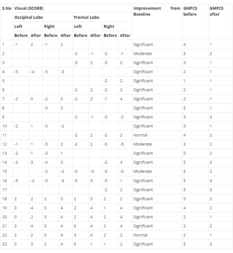 總體而言,治療結束時,2名患者的灌注正常,18名患者(12名男性和6名女性患者)顯示灌注顯著改善(>60%),3名患者顯示灌注中度改善(30-60%)。大多數在接受hESC治療前額葉和枕葉嚴重低灌注的患者在接受 hESC 治療后情況有所改善。23名可獲得SPECT掃描報告的患者的GMFCS評分在hESC治療后有所改善(表2)。