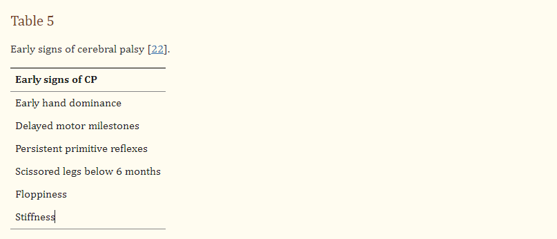 最近的一項(xiàng)研究表明,最常見的癥狀是在2歲之前使用單手,無(wú)法在適當(dāng)?shù)臅r(shí)間內(nèi)達(dá)到正常的里程碑,以及在一定時(shí)期后出現(xiàn)原始反射(表5) 。