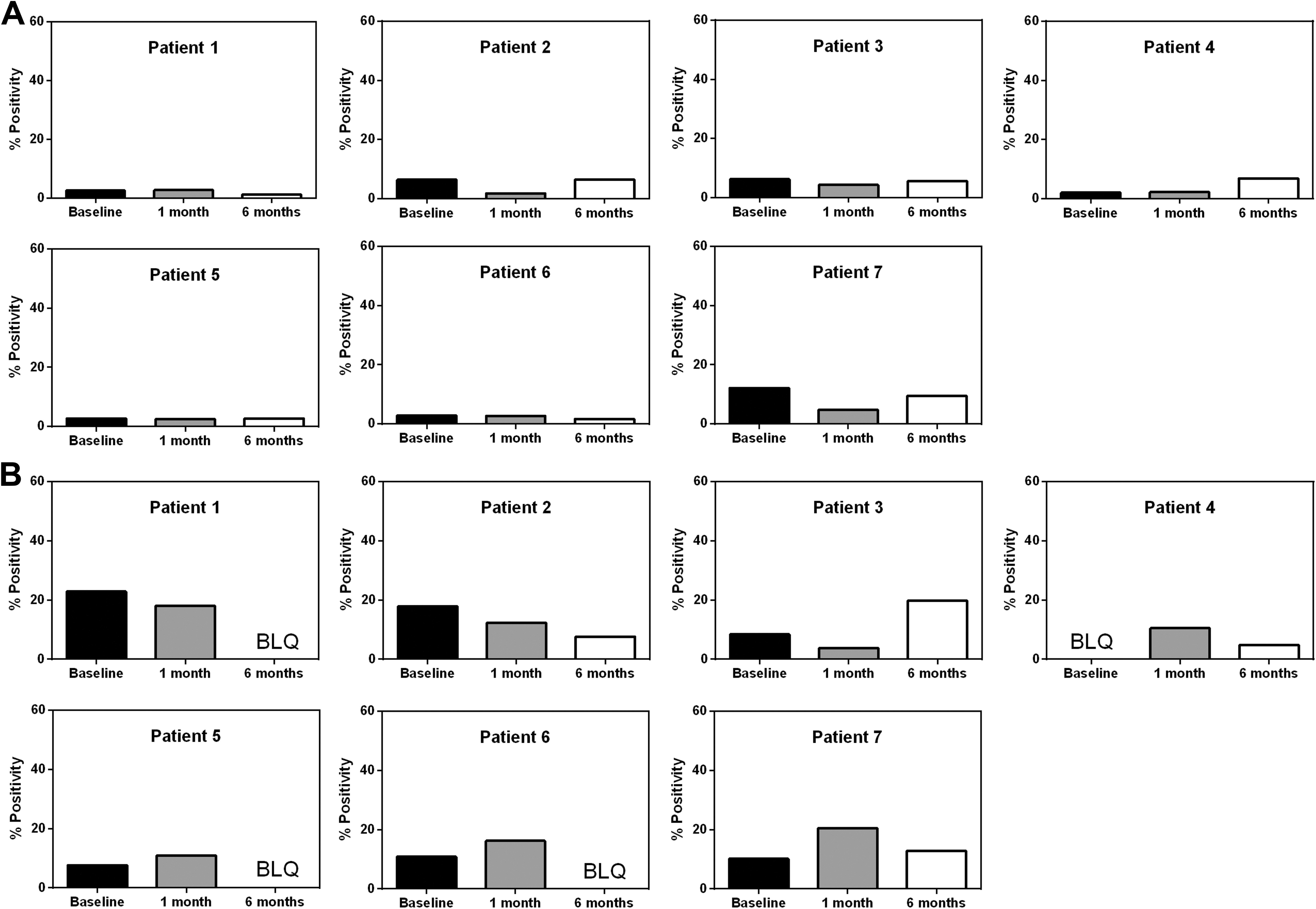 免疫原性:在血清學測定中,在P7中觀察到基線時NPC特異性抗體反應百分比最高,為12%。大多數(shù)患者在植入后1個月(服用免疫抑制劑時)和6個月(停用免疫抑制劑時)表現(xiàn)出相似或較低水平的反應,沒有超過12%(圖1A)。在細胞毒性測定中,給定時間段的三個值中的最高值用于評分。觀察到的最高基線是P1 (23%)。在1個月或6個月的隨訪中,沒有患者超過23%的基線(圖1B)。