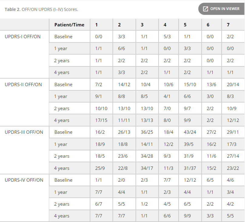 在他們的1年、2年和4年評估中,患者在Hoehn&Yahr量表(表4)上的分期以及在Schwab和England量表上的評級(表4)僅顯示出微小的變化,除了P1,誰的分數(shù)明顯變差了。