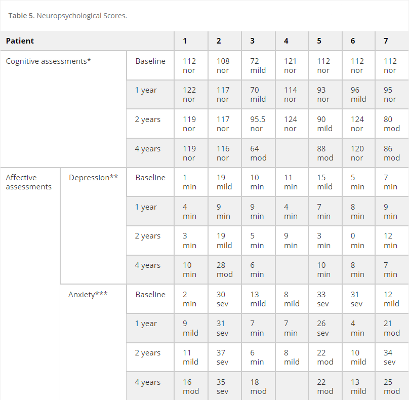 神經心理學評分如表5所示。在基線時,所有患者的認知表現(xiàn)均正常,但P3除外,其表現(xiàn)受到輕微影響。手術后,他們在術后1、2和4年的認知評估對所有患者都令人滿意,并且僅顯示出微小的變化(如果有的話)。關于他們的情感評估,在整個4年的術后研究期間,患者只有輕微的抑郁(患者2顯示中等評分),但確實表現(xiàn)出輕度至重度的焦慮水平,大多數(shù)患者在手術后保持不變,除了例外患者P5和P6似乎有所改善,而患者P7的焦慮從基線時的輕度變?yōu)閲乐?年,并在手術后4年減少回輕度。