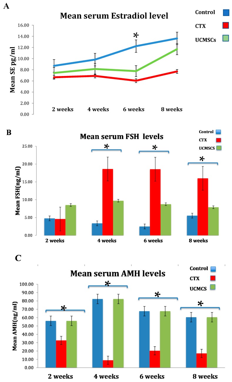 材料和方法:一項臨床前小鼠病例與載體對照隨機研究。三組中的每組都同時進行了兩個實驗。首先是證明UCMSCs恢復卵巢功能的能力。第二個是證明提高生育能力。總共36只小鼠被隨機分配;6只小鼠分成3組,每組進行2次實驗。第1組(對照組)、第2組(假化療)、第3組(干細胞)。