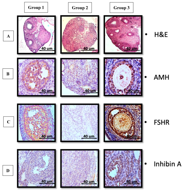 - ( B–D) 與第2組相比,第1組和第3組分別證實了AMH和促卵泡激素受體 (FSHR) 和抑制素A的表達增加。(比例尺40μm)