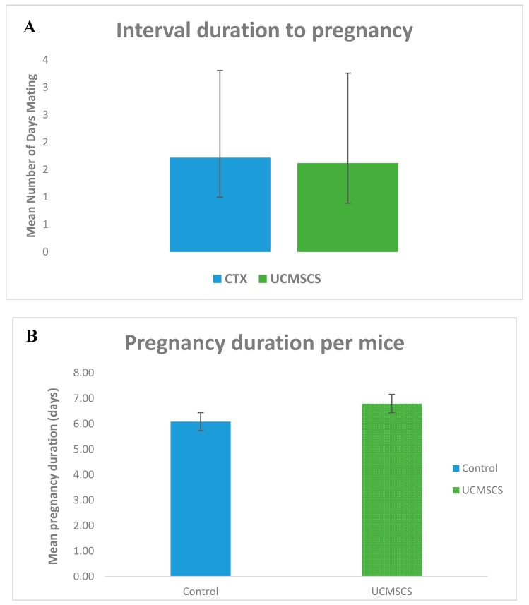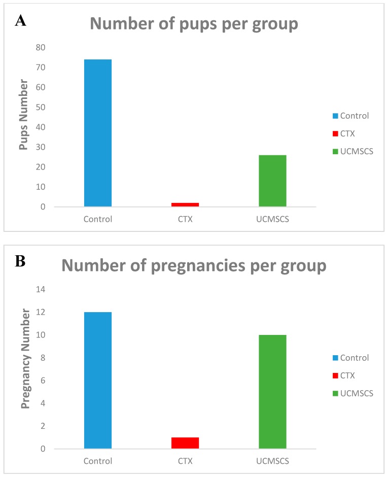 (C)和(D)UCMSCS組表現出統計學顯著性數據,p<0.05對于兩者,小鼠懷孕的次數以及產生的幼崽數量依次為。